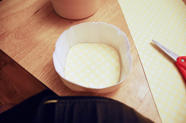 Trace the bowl around the bottom on the paper and cut out. Also make two marks for the sides and cut a strip the full width of the paper.