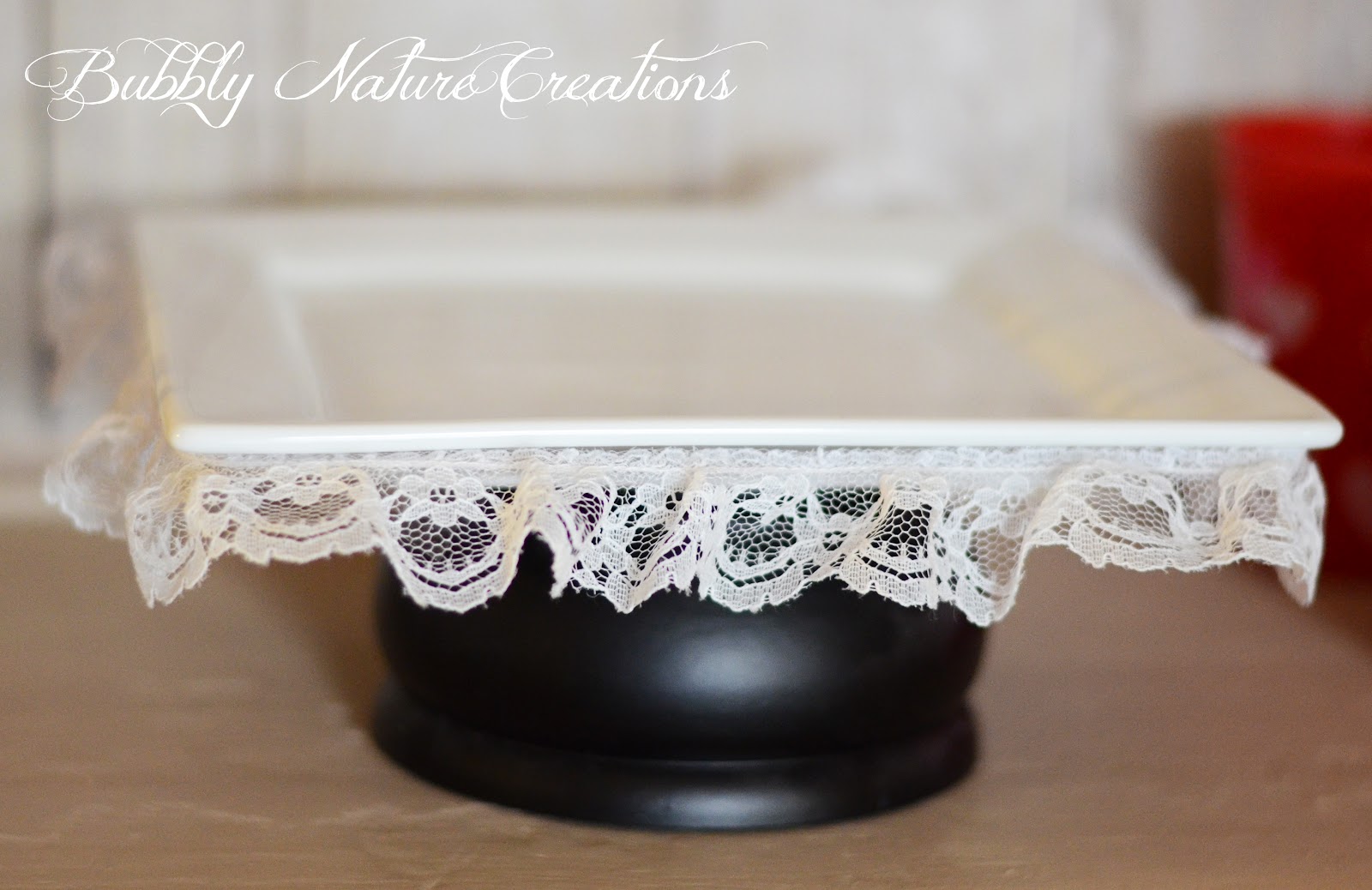 Next up is one of the simplest, but one of my favorites… I used a simple candle holder and put a square plate from Walmart on top of it. I taped lace around the plate to give it some extra flare. I think it turned out beautiful!!!