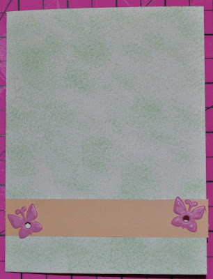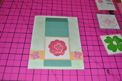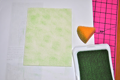 Take the largest piece of neutral cardstock, fold it in half, and stamp a design on it. I used a sponge to apply a light color.