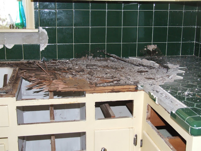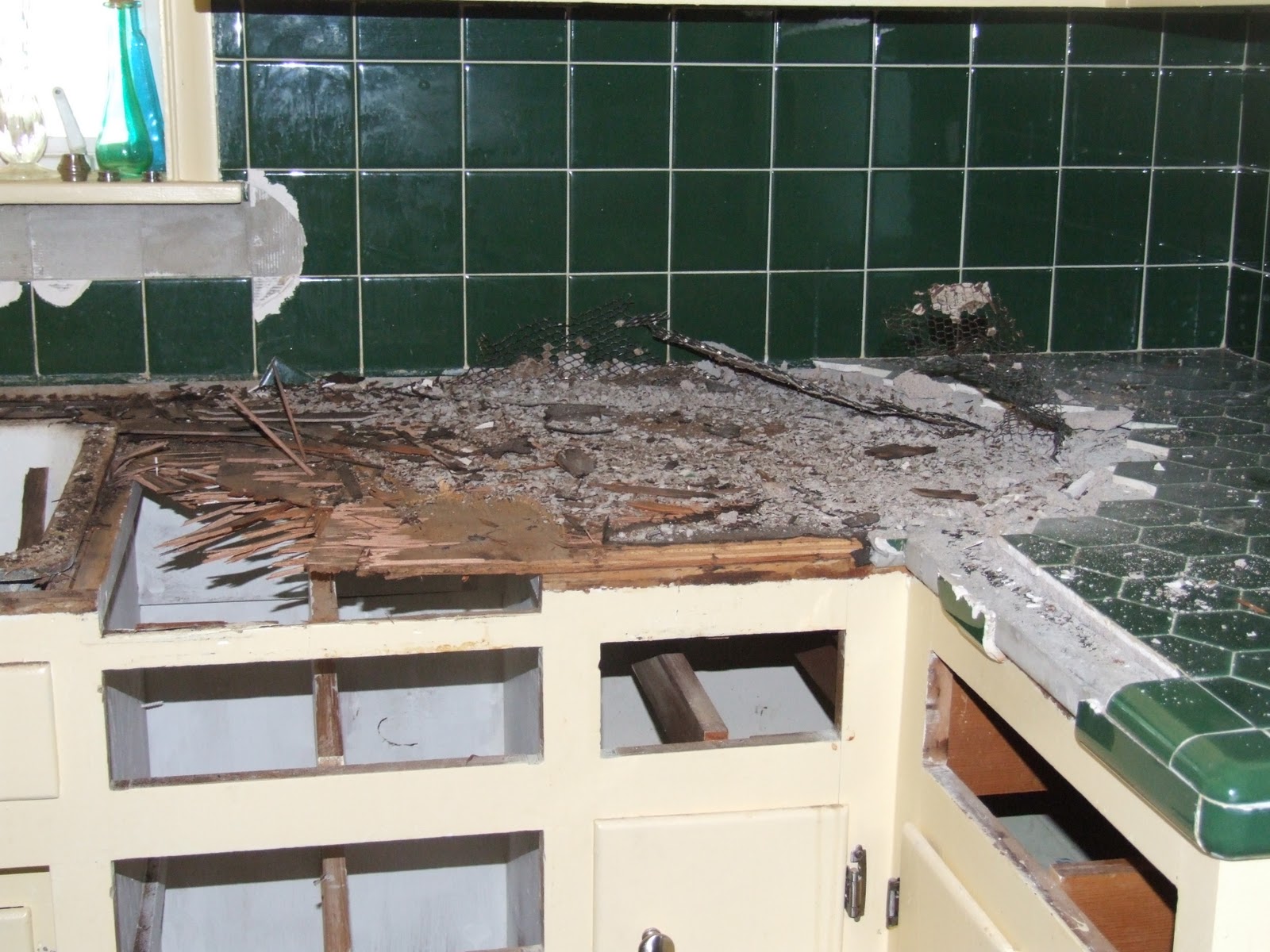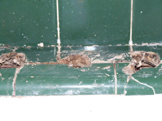 This is what was underneath the faucet. I am sure it had probably leaked at some time and it got really bad. Plus being an older house the tiles were not in great shape to begin with. The leaky faucet had actually been holding the tiles together. After taking it all apart the tiles underneath literally PEELED up. Here are some more photos: