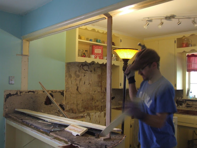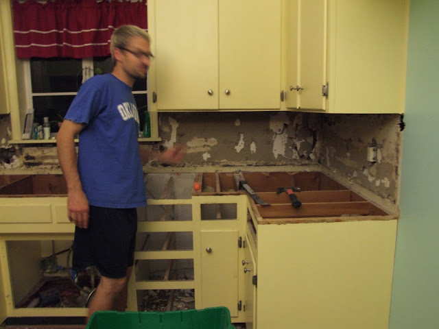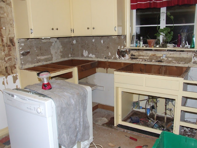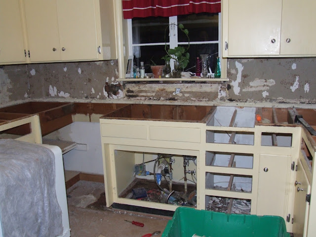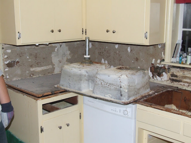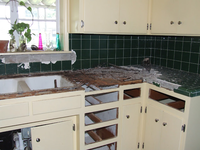 The next few months we devoted most of our extra time and energy towards one thing… the kitchen! We wanted to just replace the faucet at first, but when we uncovered all the wood rot we knew we had to do something about it. We ended up removing all the tiles and counter AND back splash (this was connected by mesh to the counter).We had some great friends and family that helped us out- they were absolutely wonderful!!! Here are some of the pics from that progress: