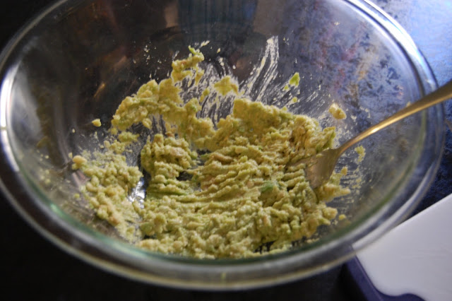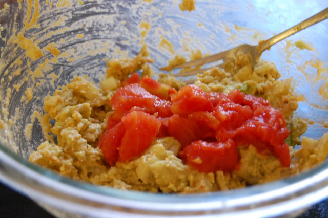 Directions: peel and take out seeds of avocados then smoosh with a fork in medium bowl. Sprinkle 4 to 5 grinds of the sea salt. Add rest of ingredients and stir lightly to combine. Serve with baked tortilla chips (recipe later). YUMM!!! Makes 8 servings.