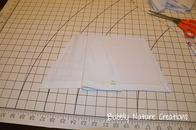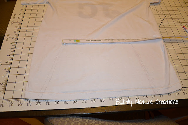 Lay the shirt out. From the bottom of the T-shirt measure up for the length like shown and mark a small dot (with something washable)… then measure out the width from the top of that dot. From there draw a gradual a-line from each end to make a skirt shape and cut out (you will cut both from and back of the T-shirt.)