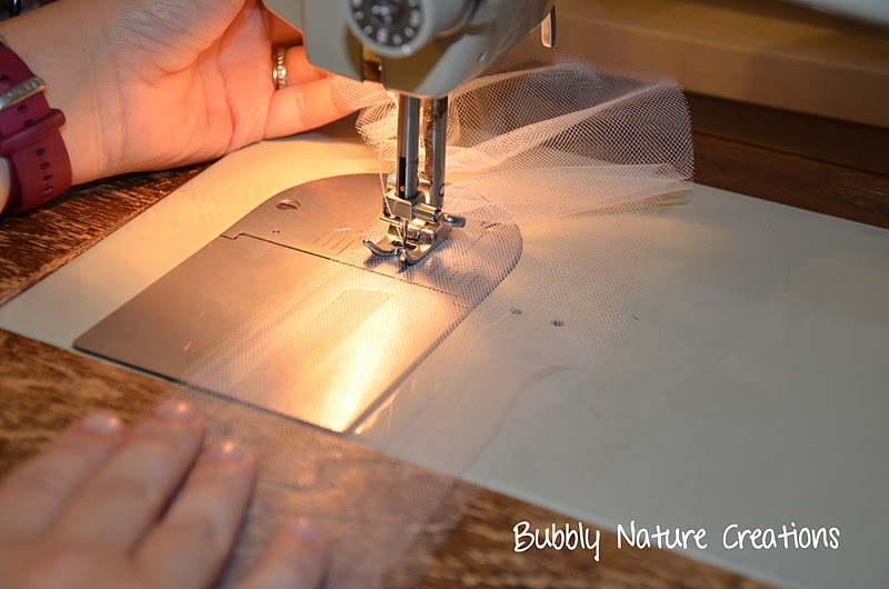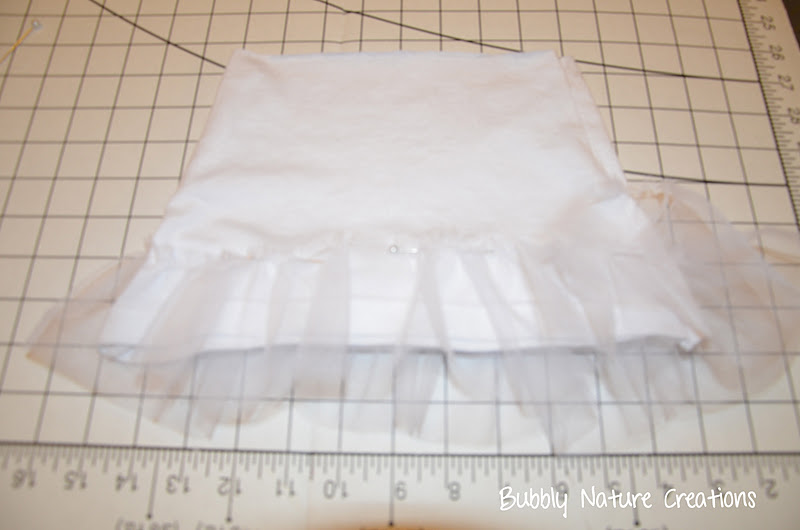 Now for the Tulle Tutu… There are 3 rows of gathered tulle for this skirt. Each row will be a little bigger than 1/3 of the length of your skirt. So if your skirt is 10 inches cut each row 3 1/2 inches long. the width of each tier will be twice as wide as the whole skirt… So measure out the largest circumference of the skirt and multiply by 2… So if your skirt is 20 inches around cut the Tulle 40 inches wide. Also be sure to cut out 2 layers of Tulle per tier. Sew the 2 layers together using a gathering stitch about 1/4 inch from the top and gather. You should have 3 gathered tiers or rows after this step.