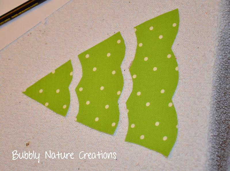 Cut out your fleece in a triangle the size of the tree. You will not scallop this except for the bottom once it is sewed on. Sew the velcro onto the back of the fleece.