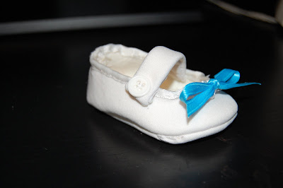 Ok so I only have one made right now, and I am not sure that I will be able to duplicate it…lol…. but here it is… the Mary Jane Baby bootie! It is so cute if I do say so! The blue bow is interchangeable… I can tie on any color of bow that I want! Plus I made it out of an old shirt and an old lap pad… Maybe I will have a tutorial if I can actually make the pair to this… this shoe looks so lonely right now- it needs it’s lefty friend!!!