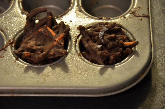 Now it’s time for the nests… Melt chocolate in the microwave in 30 second intervals until just melted. Mix the chow mein into the chocolate and fill up a mini muffin pan with the mixture.
