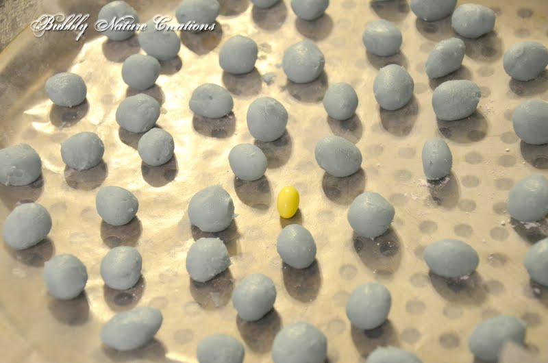 Mold quickly into eggs. Make sure to roll them quickly or they will melt in your hands! Put back in the fridge. Notice how big they are next to a jellybean. Now dust these with Cocoa Powder for the speckles by pinching a little into your fingers and rubbing them over the eggs.