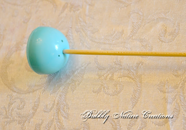 Now take a wooden skewer and push it through. Cut the skewer to whatever size you want. From here decorate with the ribbons.