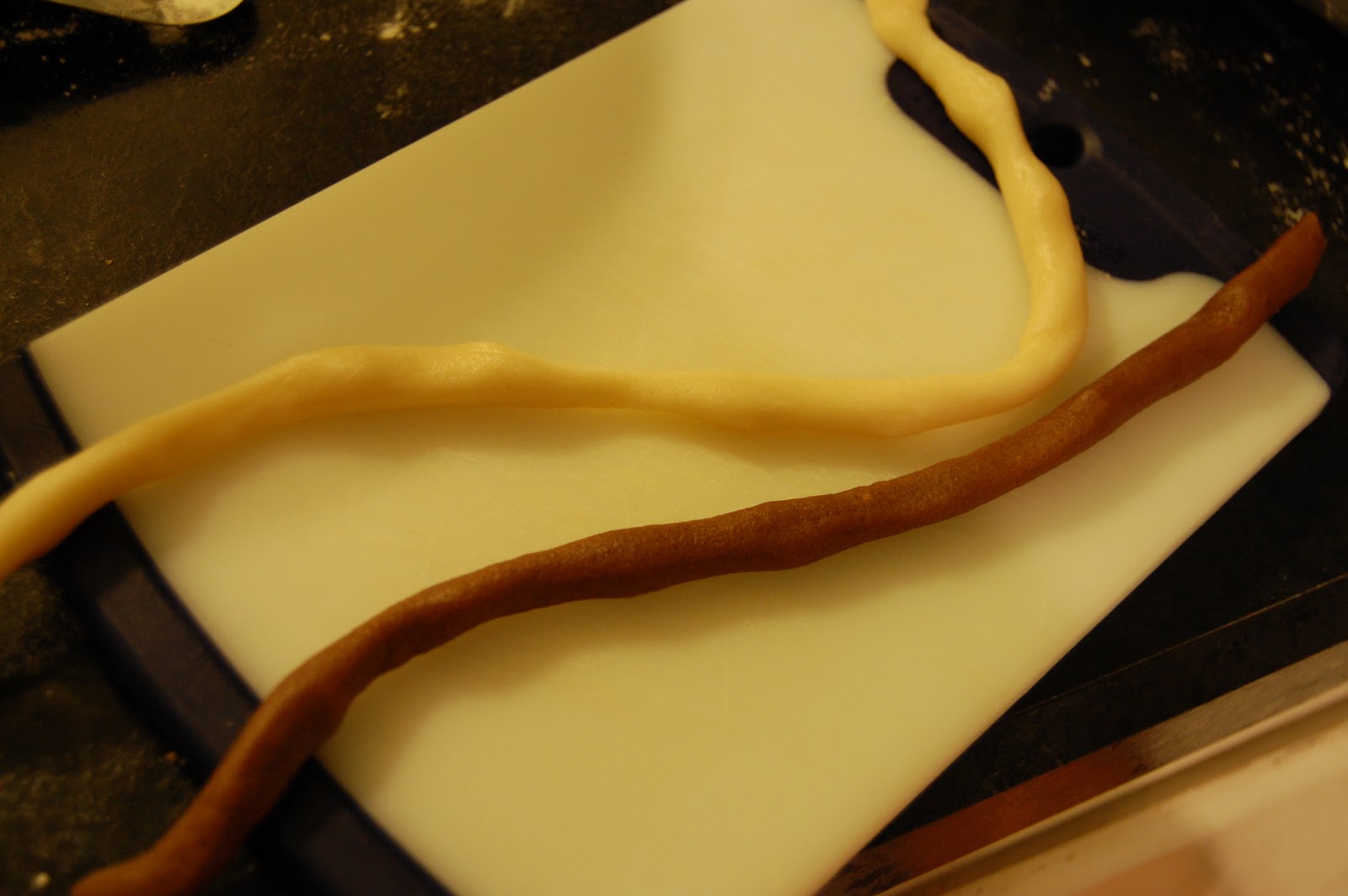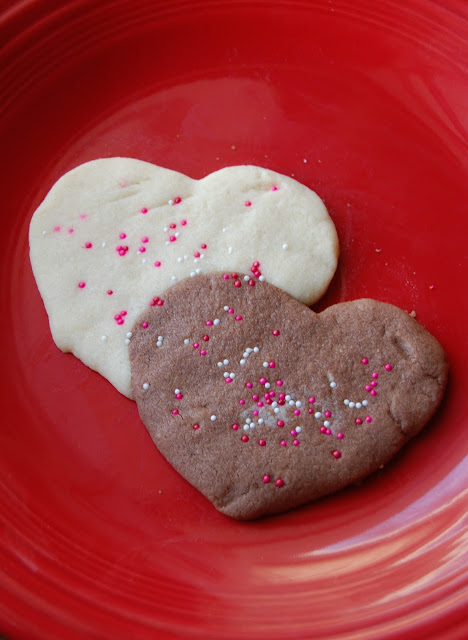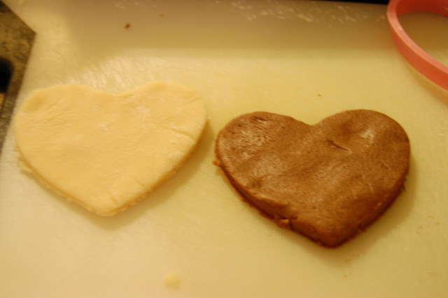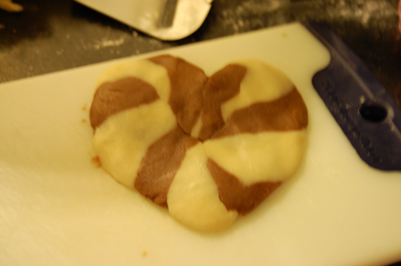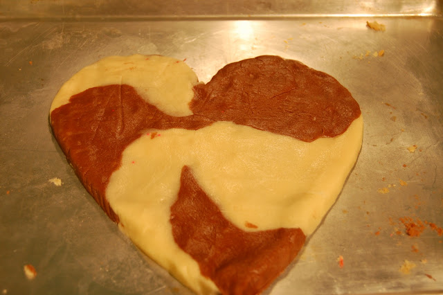 Here is a recipe for Valentine’s day! All I did was take a Betty Crocker Sugar Cookie mix and made it according to the directions… I split the dough in half and mixed 2 Tbsp. of Cocoa Powder to one half and left the other half alone. Then you have your chocolate and vanilla… here is the fun part…