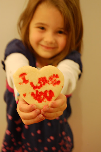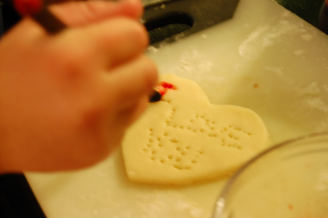For the next cookie I poked holes into it to make the words I love you… Then I let my 5 year old paint it food coloring and water.