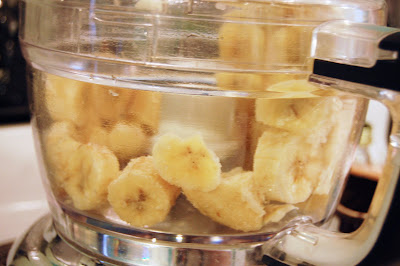 Place bananas in food processor… Please make note that your food processor will most likely “jump” when you start it up… give it a few seconds and it will stop. Also do not try this recipe in the blender because the results will not be the same.