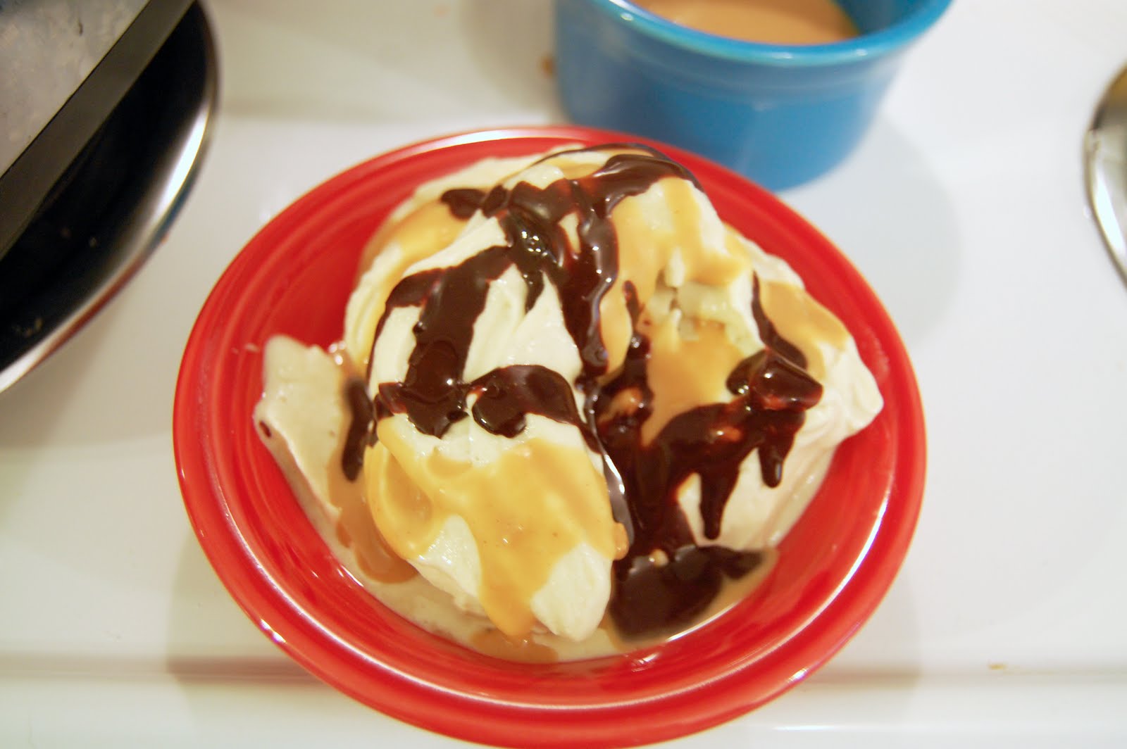 Drizzle the peanut butter and chocolate mixtures that you made onto the banana soft serve. Watch as they harden into a shell of peanut butter chocolaty goodness!!!!