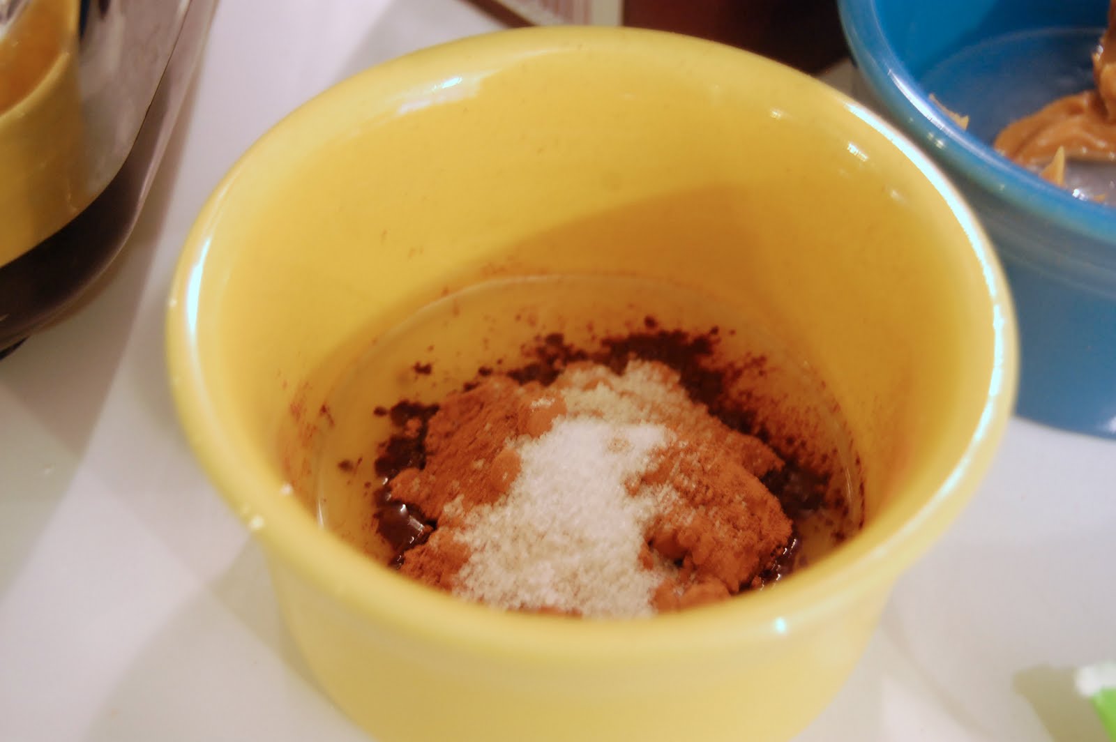 Combine Cocoa Powder, Truvia and 1 Tbls. of Coconut oil in another small bowl… set both aside.