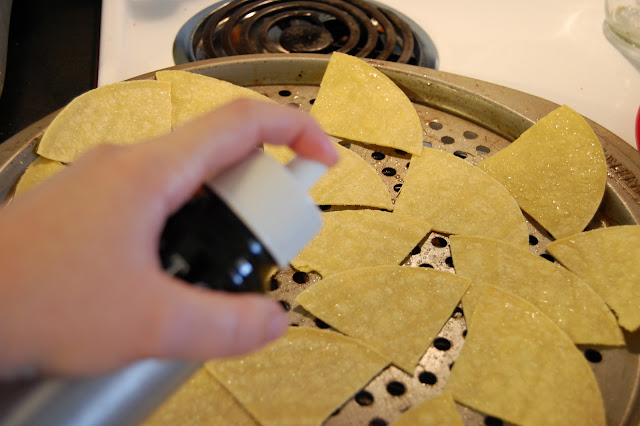 Preheat oven to 425. Cut up tortillas into 4 sections. Spray lightly with Misto and sprinkle seasoning. Bake 10 minutes or until they are starting to brown.