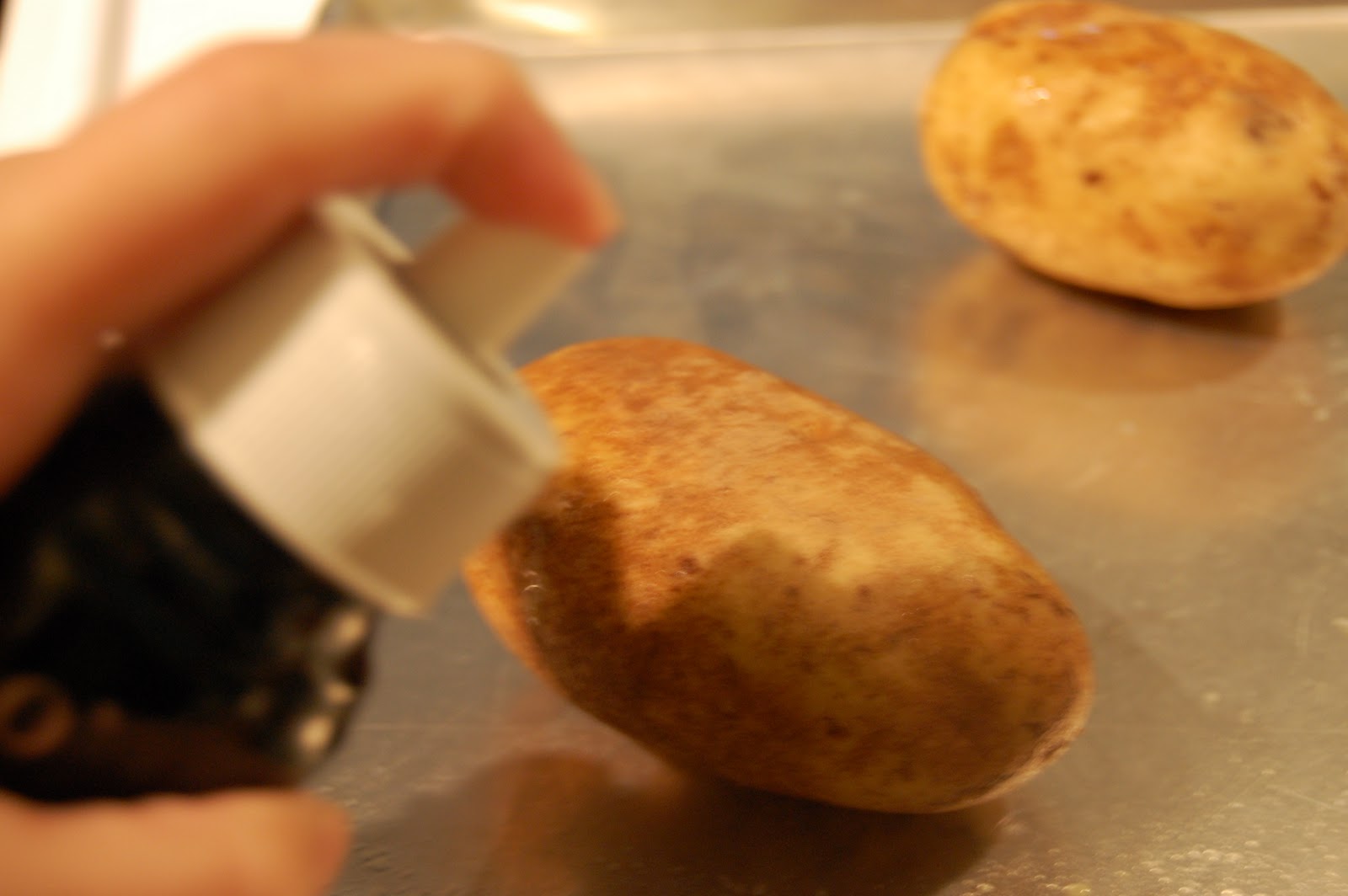 First Recipe using the Misto is baked potatoes. Just wash and scrub your potatoes and dry them off. Spray with the Misto then add some salt. Bake at 350 for about an hour… perfect baked potatoes!