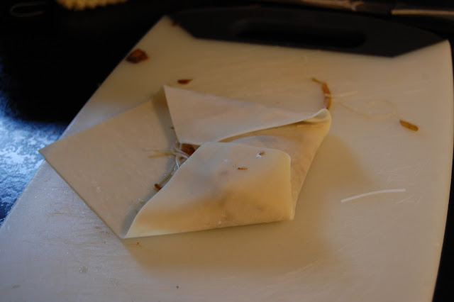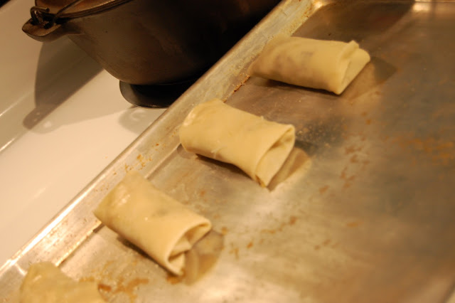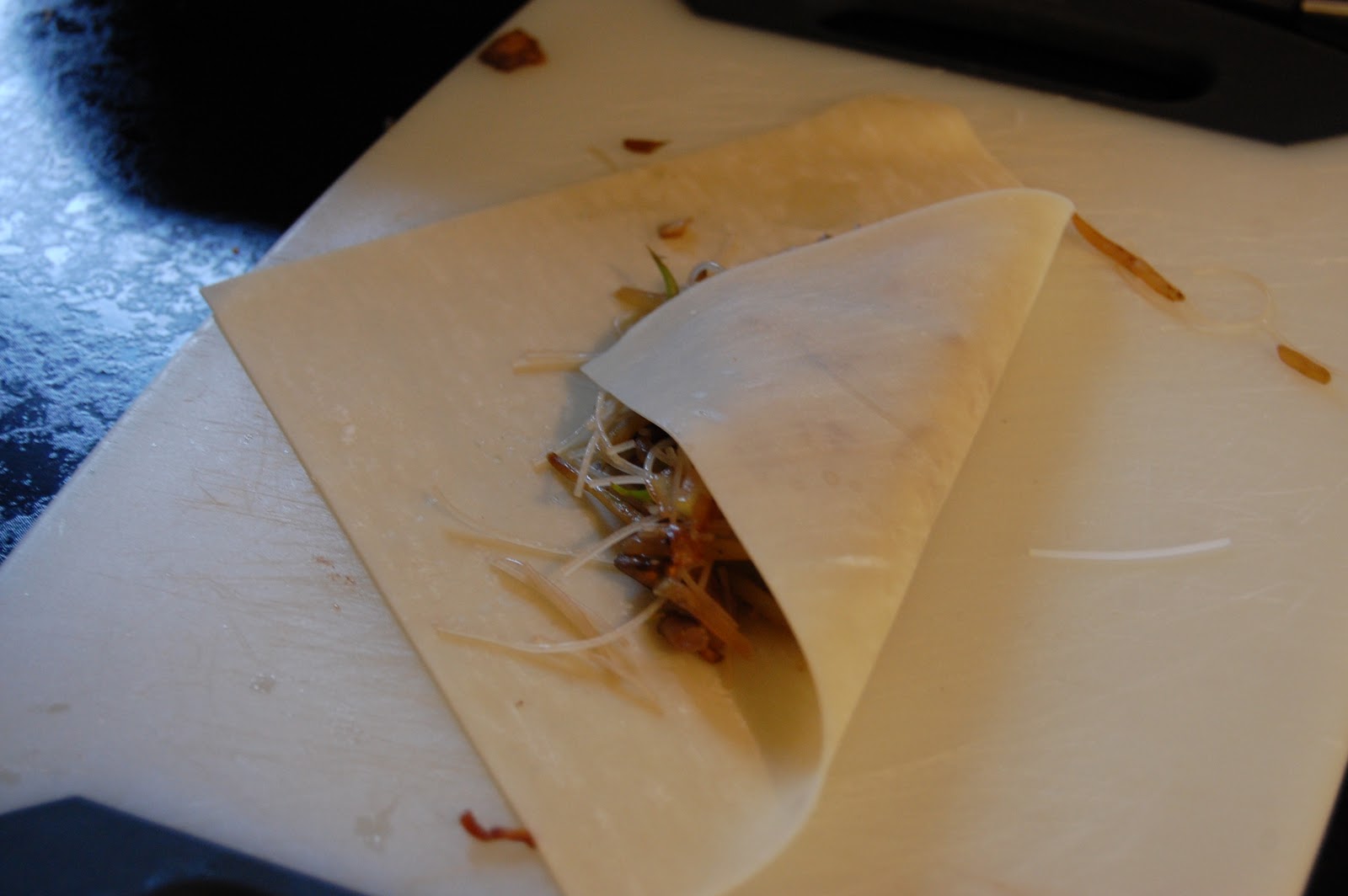 Take an egg roll wrapper and place 2 tablespoons of mixture inside… roll according to directions. Repeat for remaining roll wrappers.