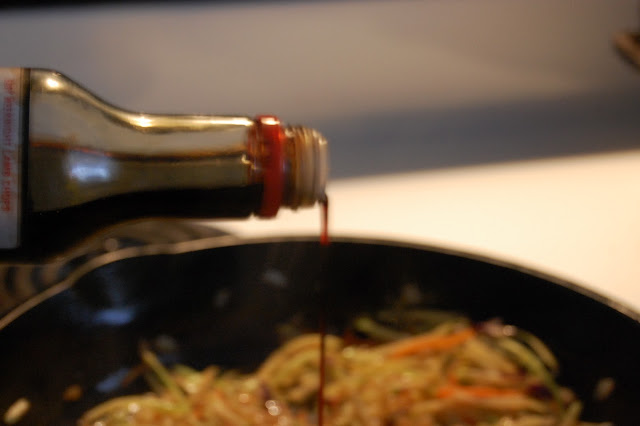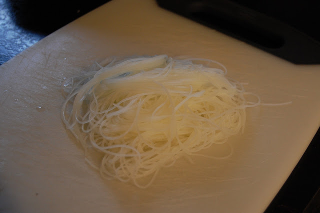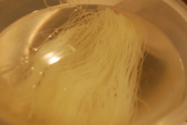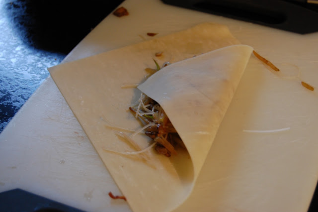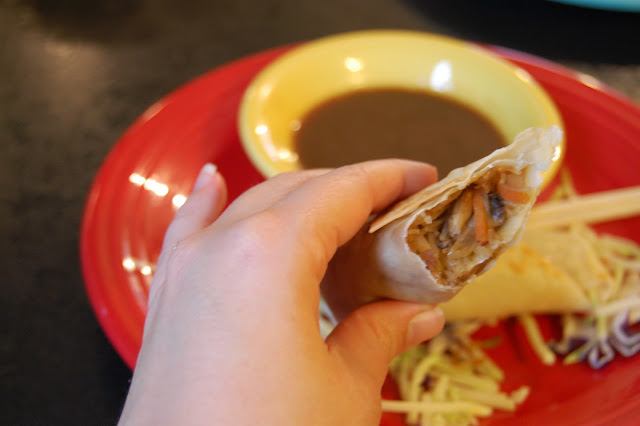 Preheat Oven to 415 degrees. Soak rice noodles in hot water in separate bowl. Spray small skillet with oil and saute mushrooms. Meanwhile heat larger skillet with 1 Tbsp. Canola oil and saute onions and garlic until tender… add cole slaw mix to this and keep cooking. Once everything is tender add soy sauce and mushrooms. After 10 minutes of soaking rice noodles- chop and place into rest of mixture.