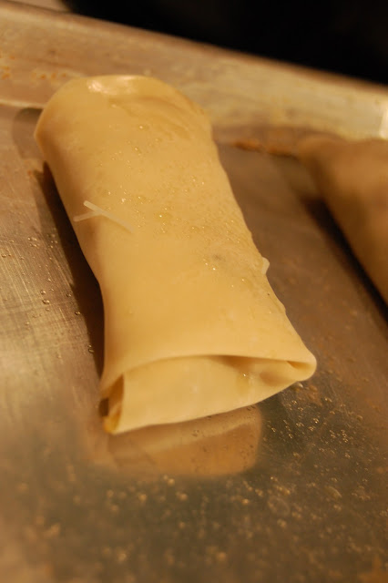 Once everything is wrapped place on an oil sprayed cookie sheet. Spray tops of egg rolls with oil or cooking spray oil.