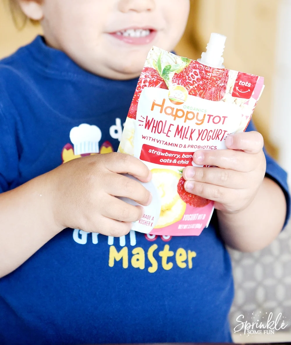 It’s our favorite yogurt now and I feel good that he’s not getting any added sweeteners with it! We get the Happy Tot yogurt pouches from Walmart and you can find them in the refrigerator section of the store.