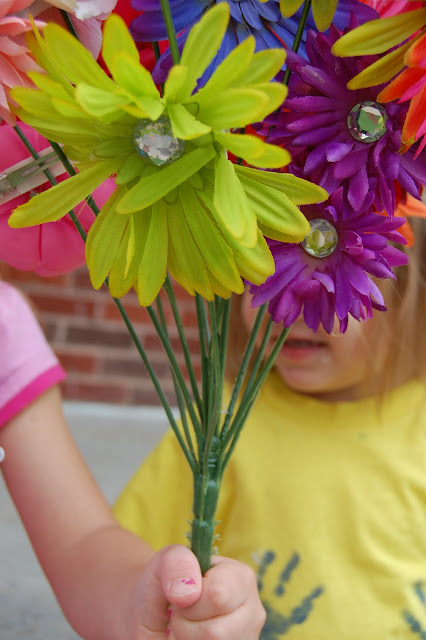 The next step is to take your bouquet of stems and clip the flower hair bows to it.  If you don’t have a lot of flower hair bows then go ahead and leave some of the artificial flowers that were already on the bouquet to help fill it out a bit.