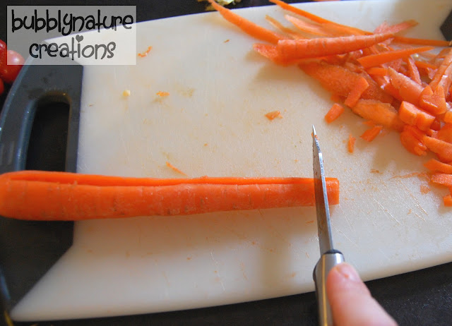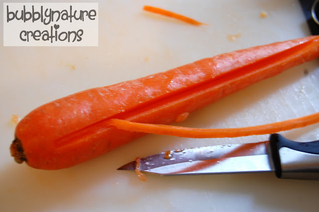 Once you are done with the peppers start on the carrots.  Make 2 shallow slices on the top of the carrot and then peel it out.
