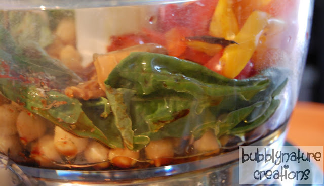 After draining the chickpeas place them in the food processor with everything else.  Blend until a semi-smooth consistency.