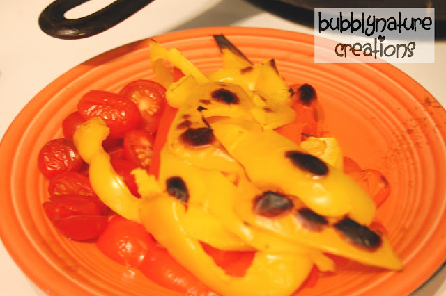 Take the left over pieces of peppers and tomatoes and broil them on high until they start to look like this.