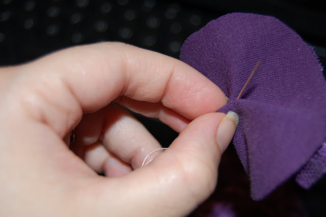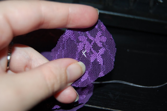 Now for the trickiest part- not really tricky, but it helps to know a bit about sewing here… you want to make gathers/ puckers from the middle and sew it secure- be sure to keep your stitches in the middle or they will show.  You will be doing this to each layer from here on out… so once you have the gathers the way you like them- start sewing on the next size circle and do the same…