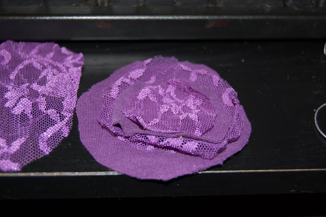 Start out by making 2 large circles (about 4 inches)- the second one slightly smaller (I used 2 different fabrics for this flower) They don’t have to be perfect… it fact I think it looks better slightly off!