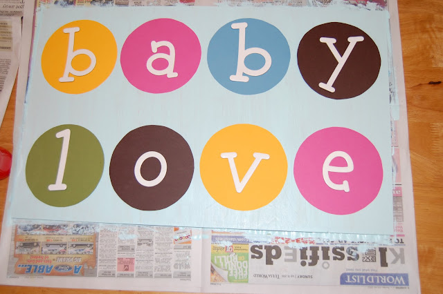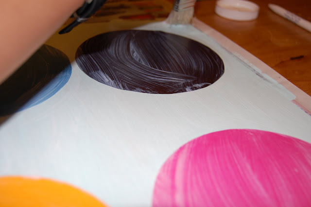 Leave the circles in place and remove letters. Paint the Mod Podge to the back of one circle and place on the board where you laid it out. Repeat for each circle.