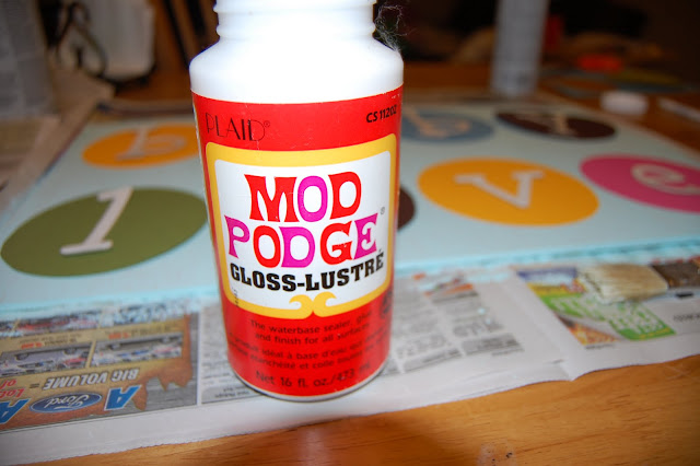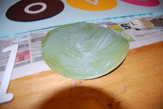 Leave the circles in place and remove letters.  Paint the Mod Podge to the back of one circle and place on the board where you laid it out.  Repeat for each circle.