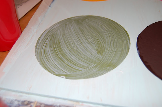 You said: "After all circles have the Mod Podge on top paint the board around them following the grain again."