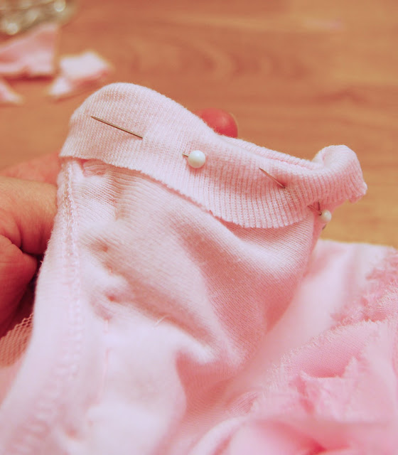 Hand stich the rosettes to the collar of the onesie. After that cut the sleeves off just enough so that there is enough material to make a double roll on the inside.