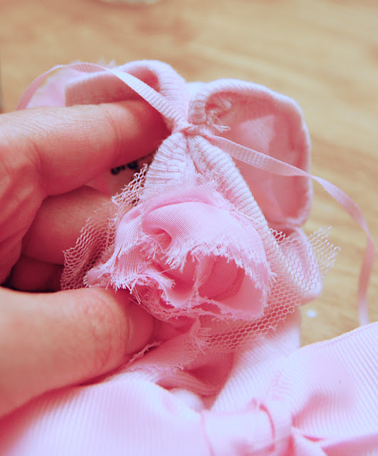 Now it’s time to start sewing! The Zig Zig stitch works best- because this will need to stretch! The pic below is what they looked like before adding them… notice that they are all placed on a tulle backing. Also I don’t have a picture of the grosgrain ribbon, but I just tied a long bow and attched it to the side of the onesie after putting on the rosettes. See that layer of tulle just under the rosettes??? That is where you will make your stitches. If you need to secure the rosettes even more then take a needle and thread and make an X through the middle of each rosette- individually. This ensures that the rosettes will still stretch with the rest of the onesie.