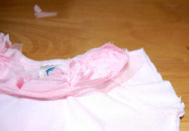 Now it’s time to start sewing!  The Zig Zig stitch works best- because this will need to stretch!    The pic below is what they looked like before adding them… notice that they are all placed on a tulle backing. Also I don’t have a picture of the grosgrain ribbon, but I just tied a long bow and attched it to the side of the onesie after putting on the rosettes. See that layer of tulle just under the rosettes???  That is where you will make your stitches.  If you need to secure the rosettes even more then take a needle and thread and make an X through the middle of each rosette- individually.  This ensures that the rosettes will still stretch with the rest of the onesie.