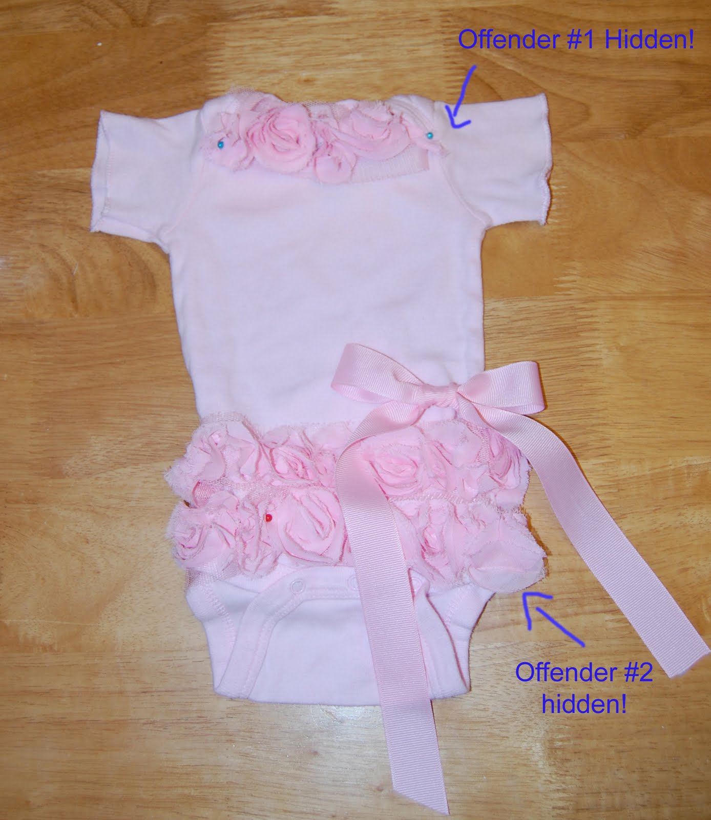 ruffles or rosettes- found mine at Hobby Lobby- I used 1 yard which was “just enough” for the newborn size, so you will need more for a bigger size onesie (it was 5.99 a yard, but I used a 40% off coupon at Hobby Lobby- they do this promotion a lot!)