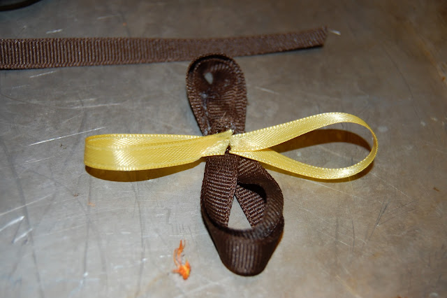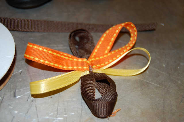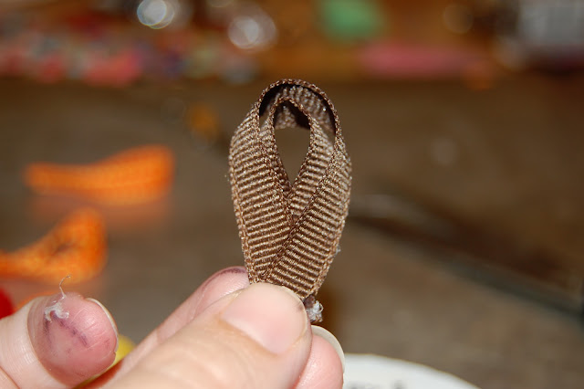 First start making small loops with your ribbon and secure each with hot glue.  They look like the loops on the awareness ribbons.  you will need 2 yellow, 2 orange, and 1 red…Leave them all separated…