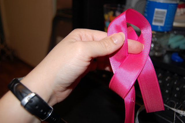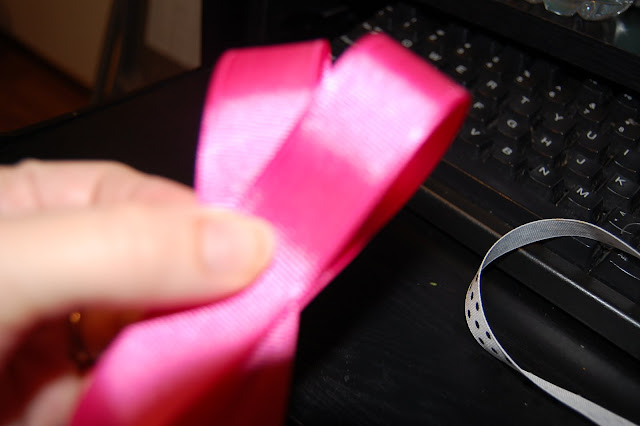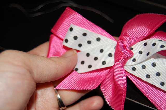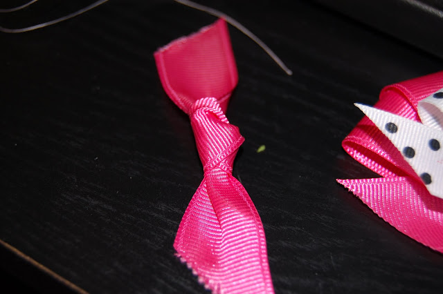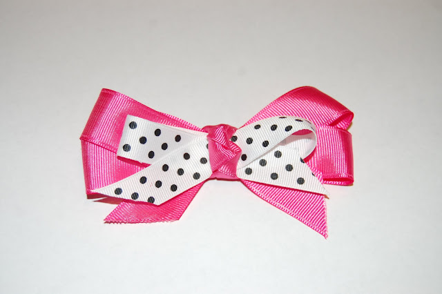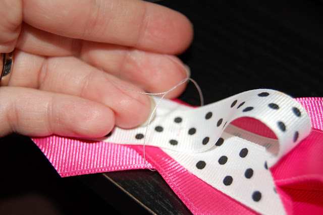 I took lots of pics so bear with me here… this particular bow was made with hot pink 7/8″ grosgrain ribbon and black and white polka dot ribbon in smaller size (it does not state size on package!). I used an alligator clip covered with ribbon- see my other tutorials on how to do this here. You will also need a needle, thread and hot glue…