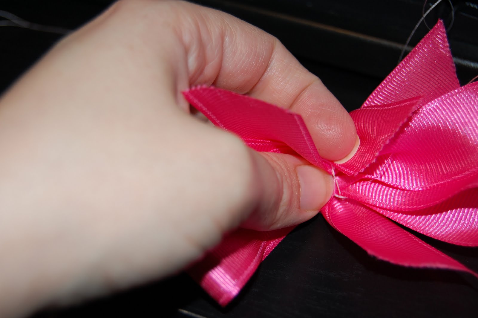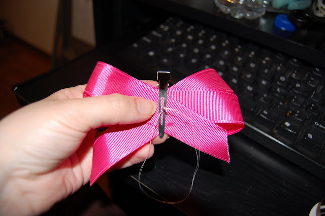 Make your final loop to make 4 loops in all…then take an alligator clip and secure ribbon in place. You can make subtle changes to the shape of the bow at this point. Once you have the bow the way you want it start sewing a simple stitch several times through the middle. This particular alligator clip I used was perfect for this because I did not have to remove it to make the stitch.