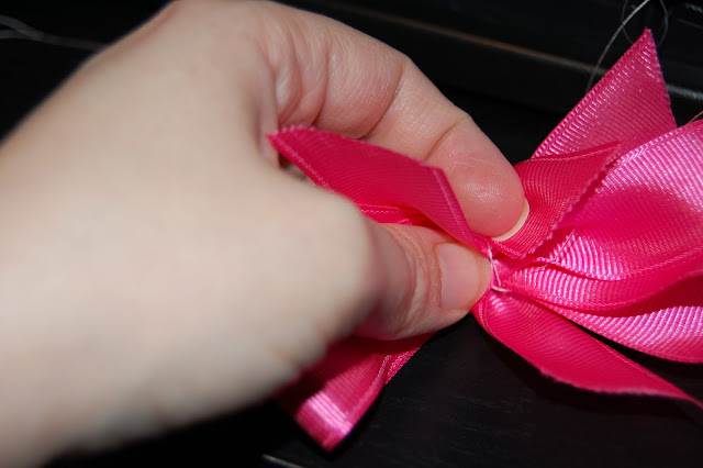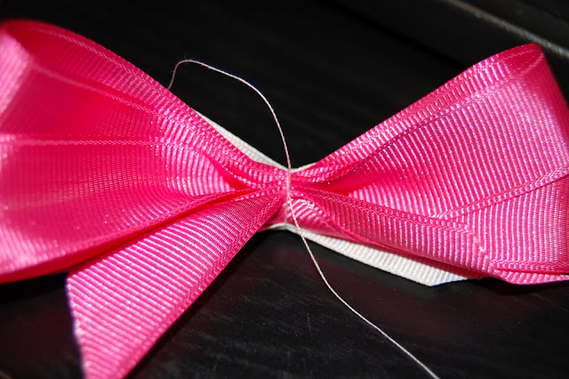 At this point you are ready to make your bow look more like a bow! Many use wire for this next step, I personally prefer the method shown below. Take a medium length of thread and wrap it around the bow in the middle. Tightly tie a knot to where the ribbon is scrunched up in the middle. Wrap thread around again to the back side and make another tight knot. Cut off any loose threads.
